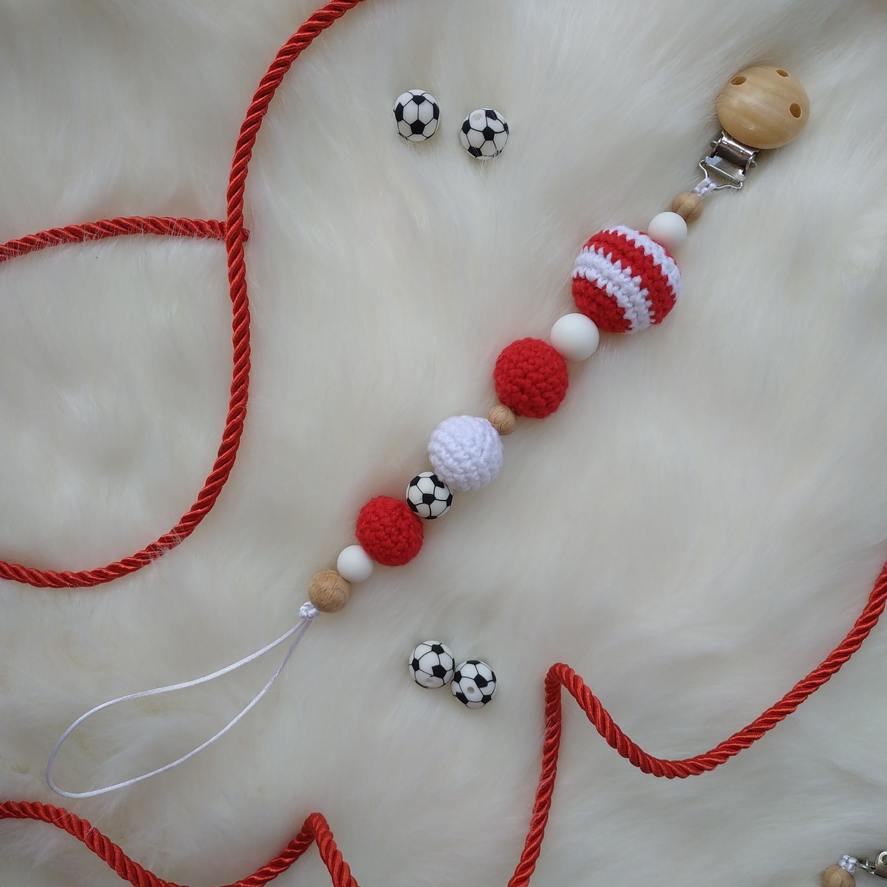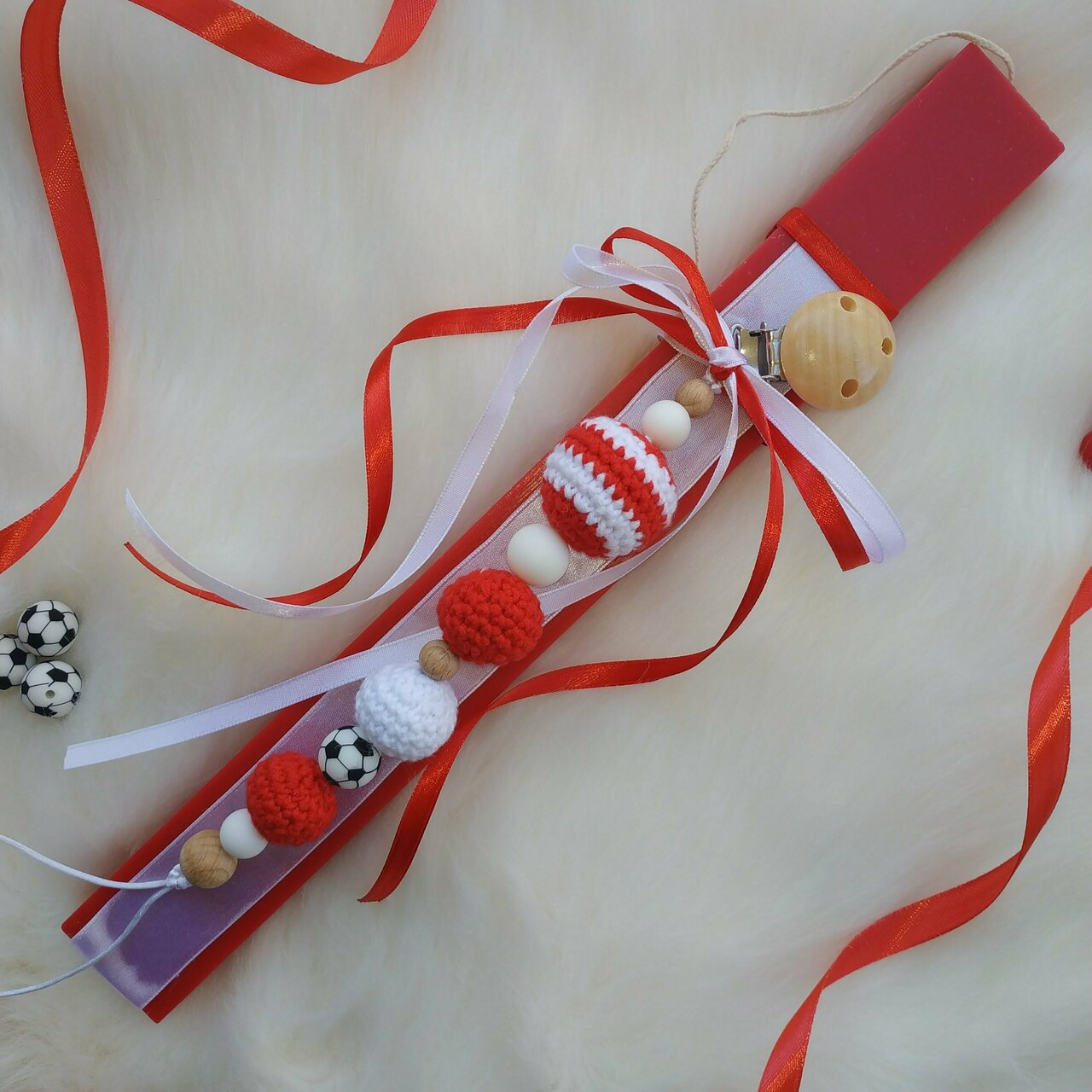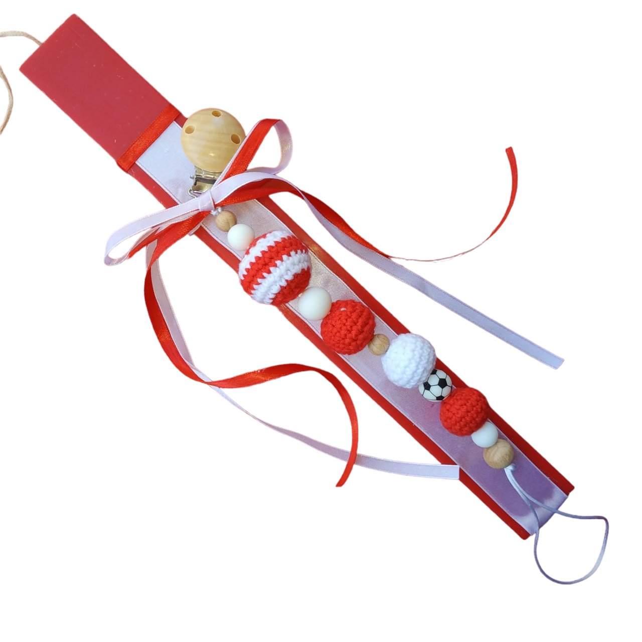 Ερυθρόλευκη λαμπάδα με ξύλινο κλιπ πιπίλας με ένα μεγάλο πλεκτό στρογγυλό κόκκινο λευκό, δυο πλεκτά στρογγυλά κόκκινα, ένα άσπρο (νήμα ειδικό για κουκλάκια και γέμιση υποαλλεργικη), χάντρα μασητική σιλικόνης μπάλα, λευκές χάντρες μασητικες σιλικόνης και ξύλινες (κατάλληλες για μωρά (Latex free, BPA free, PVC free, Nitrosamine free, Phthalate free). Η λαμπάδα είναι στολισμένη με ερυθρόλευκες κορδέλες. Μπορεί να συνδυαστεί με ασορτι: πλεκτό ματάκι, πλεκτό πανάκι παρηγοριάς (νάνι), πλεκτή κουδουνίστρα-μασητικό, απλό πλεκτό κλιπ πιπίλας. Θα τη λάβετε σε συσκευασία δώρου.