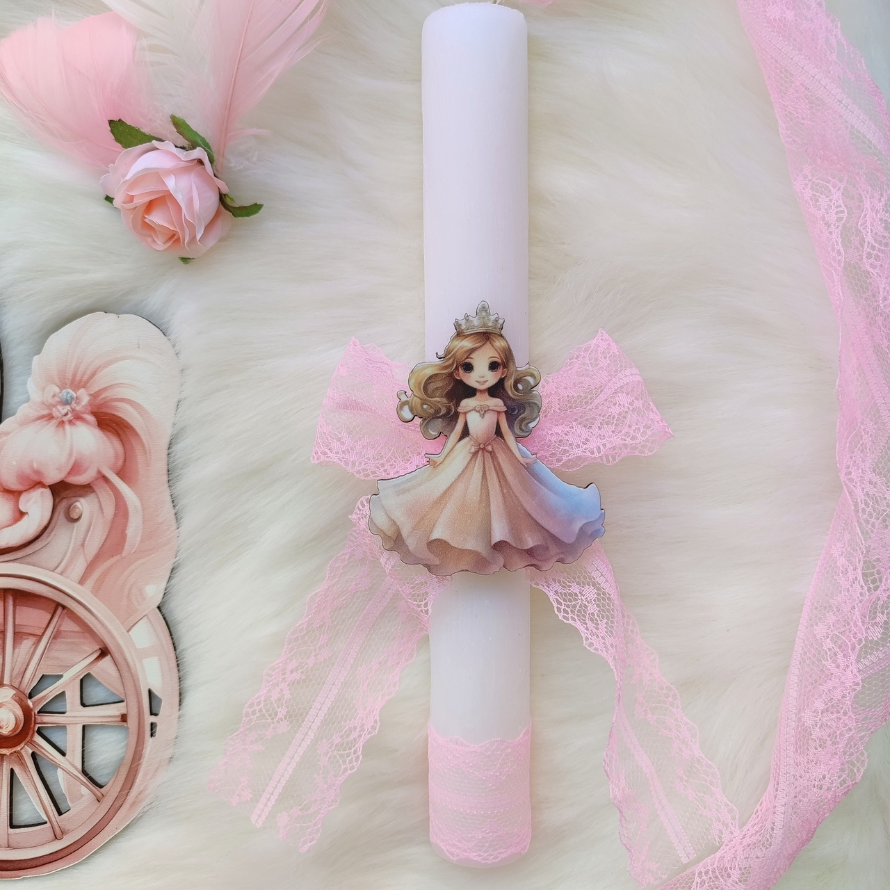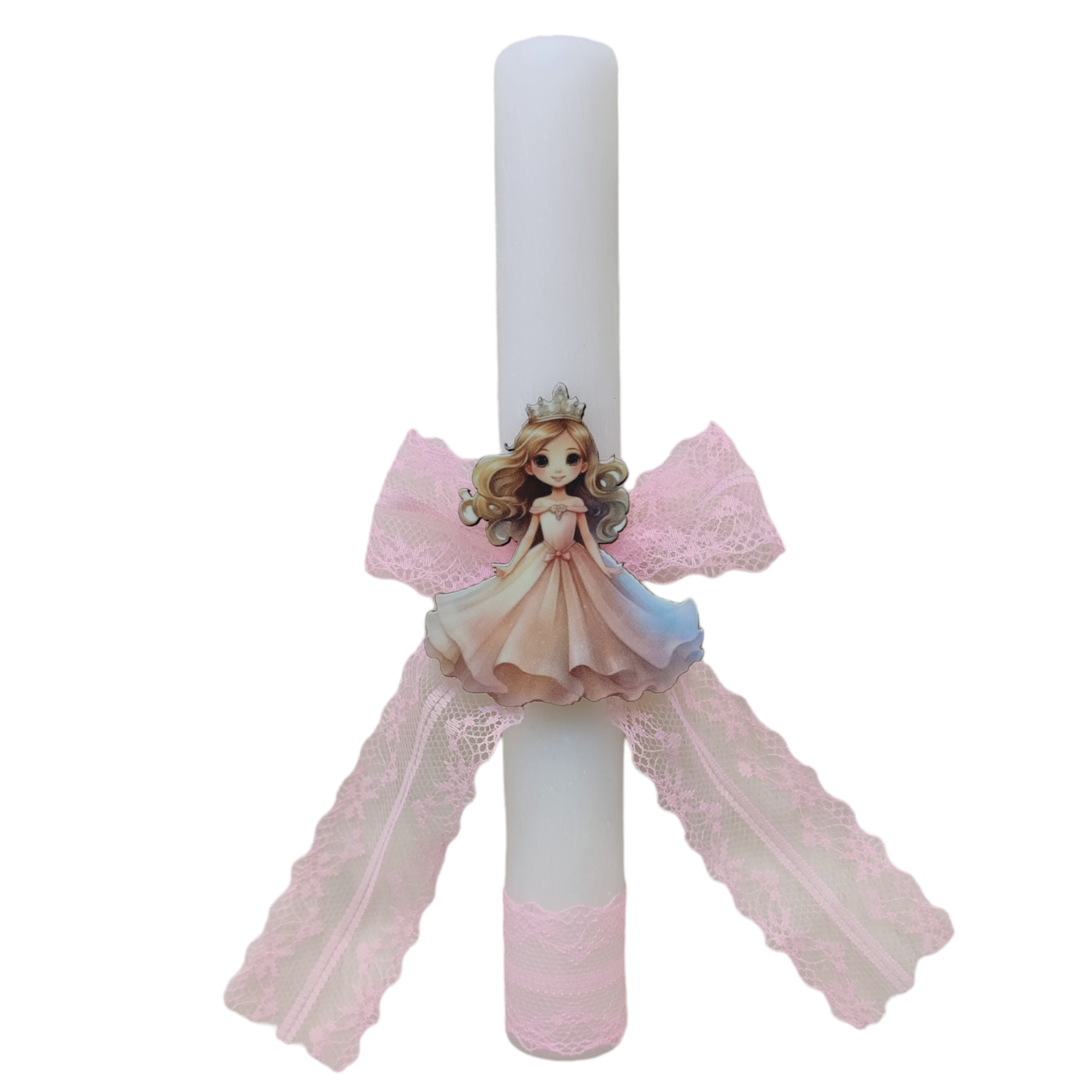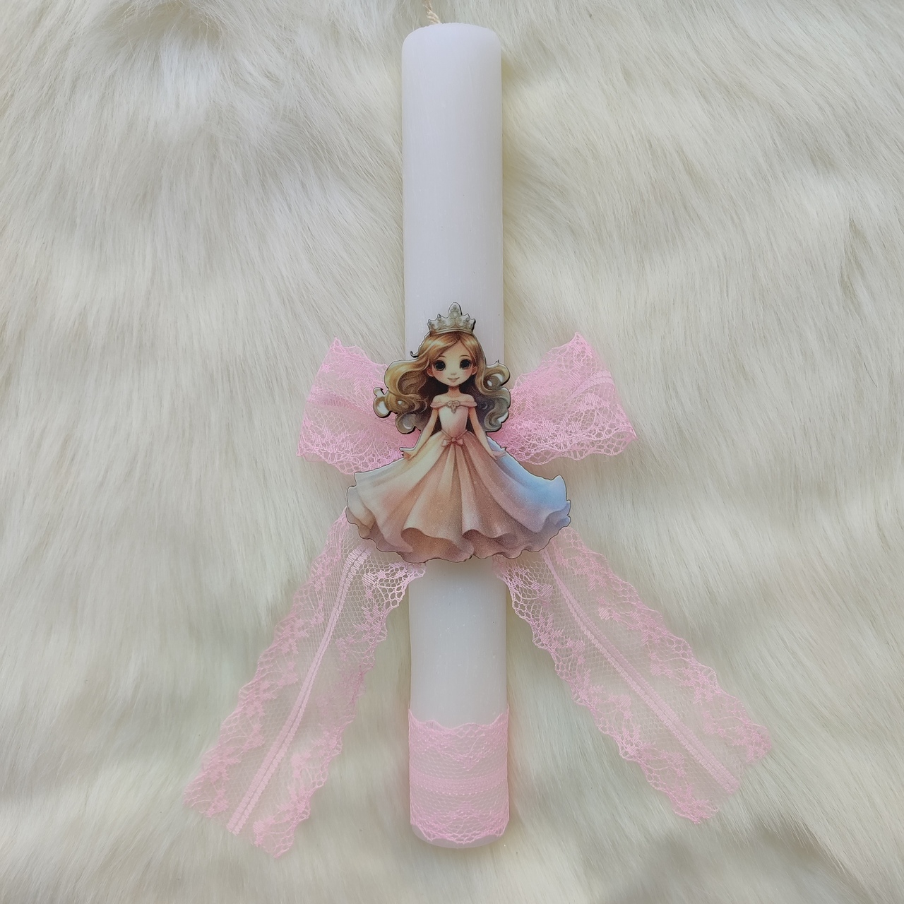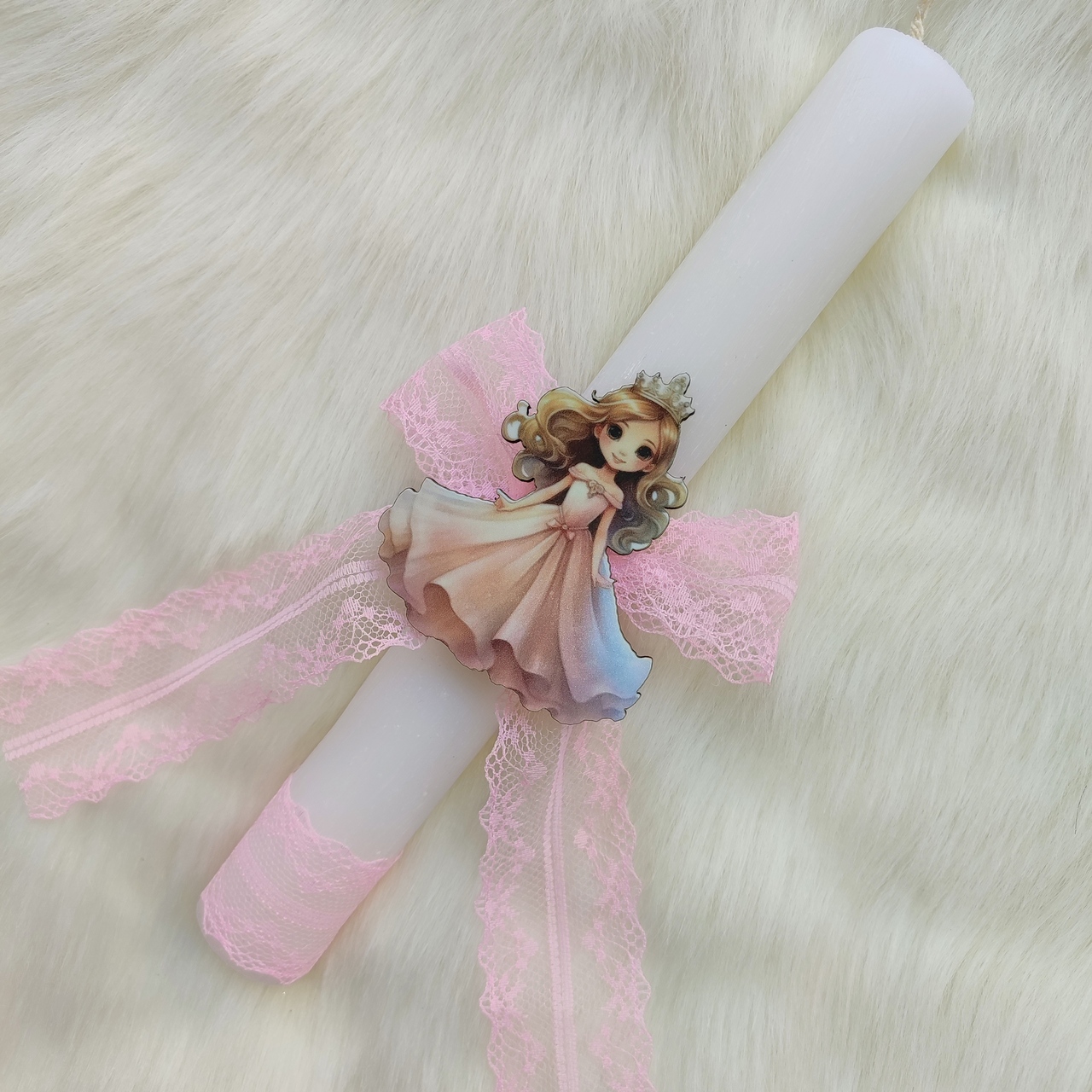 Λευκή λαμπάδα, 25 εκ, στολισμένη με ροζ δαντελένια κορδέλα και ρομαντική πριγκίπισσα!