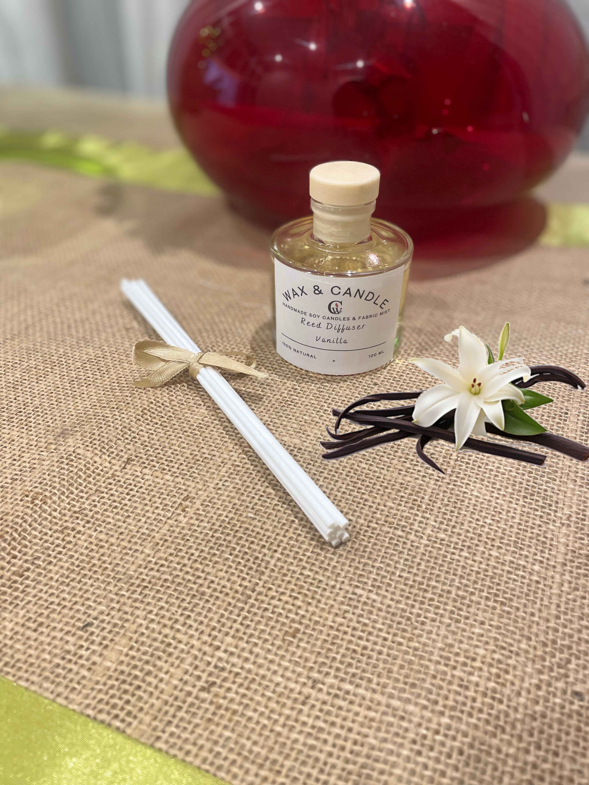 Ανανεώστε τον χώρο σας με το χειροποίητο και οικολογικό Reed Diffuser της Wax & Candle. Ένα κομψό γυάλινο μπουκαλάκι 100ml χωρίς προσθήκη αλκοόλης, που διαχέει υπέροχα το άρωμα βανίλιας μέσω φυσικών rattan sticks.