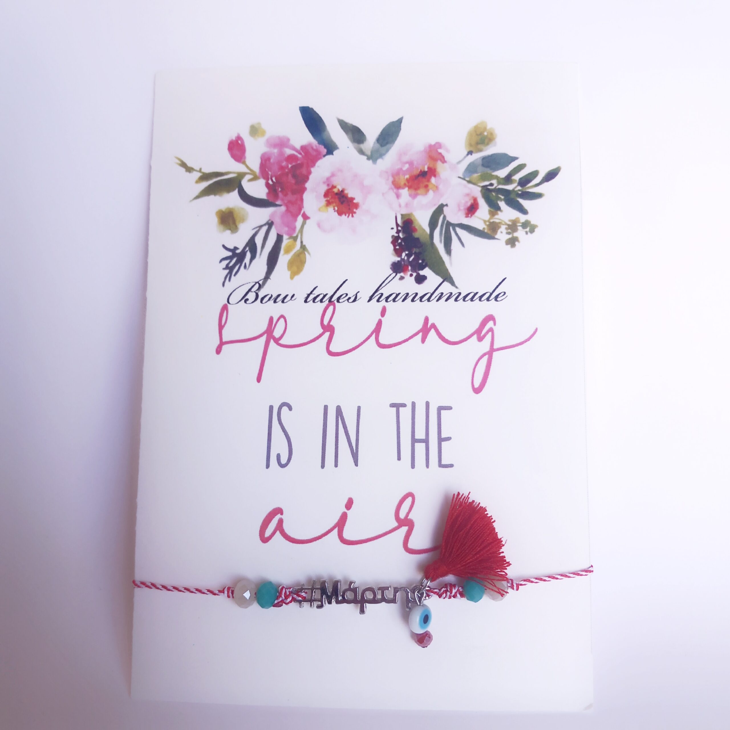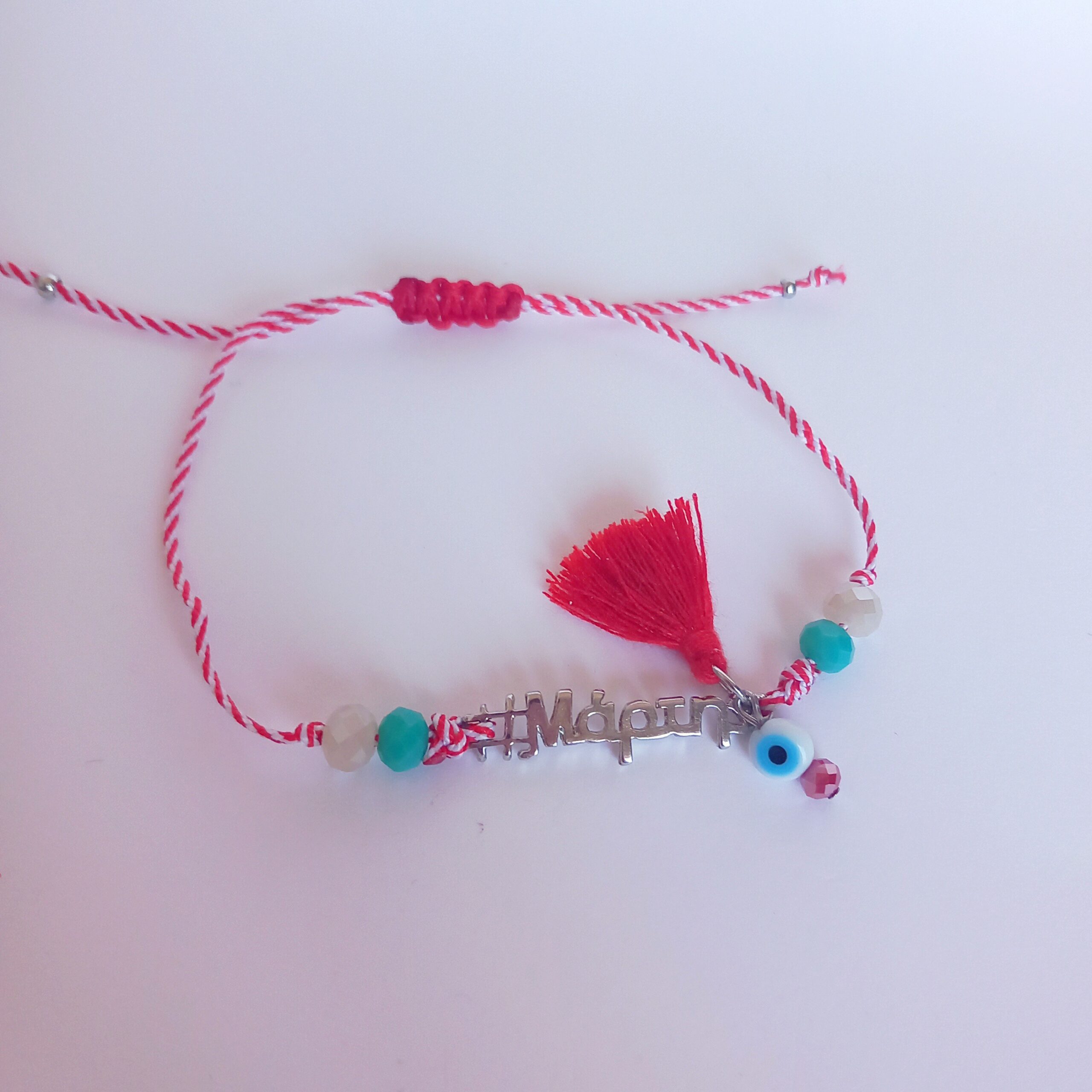 Χειροποίητο μαρτάκι με μακραμέ κούμπωμα, φουντάκι και ματάκι. Το βραχιόλι στέλνεται μαζί με την κάρτα.