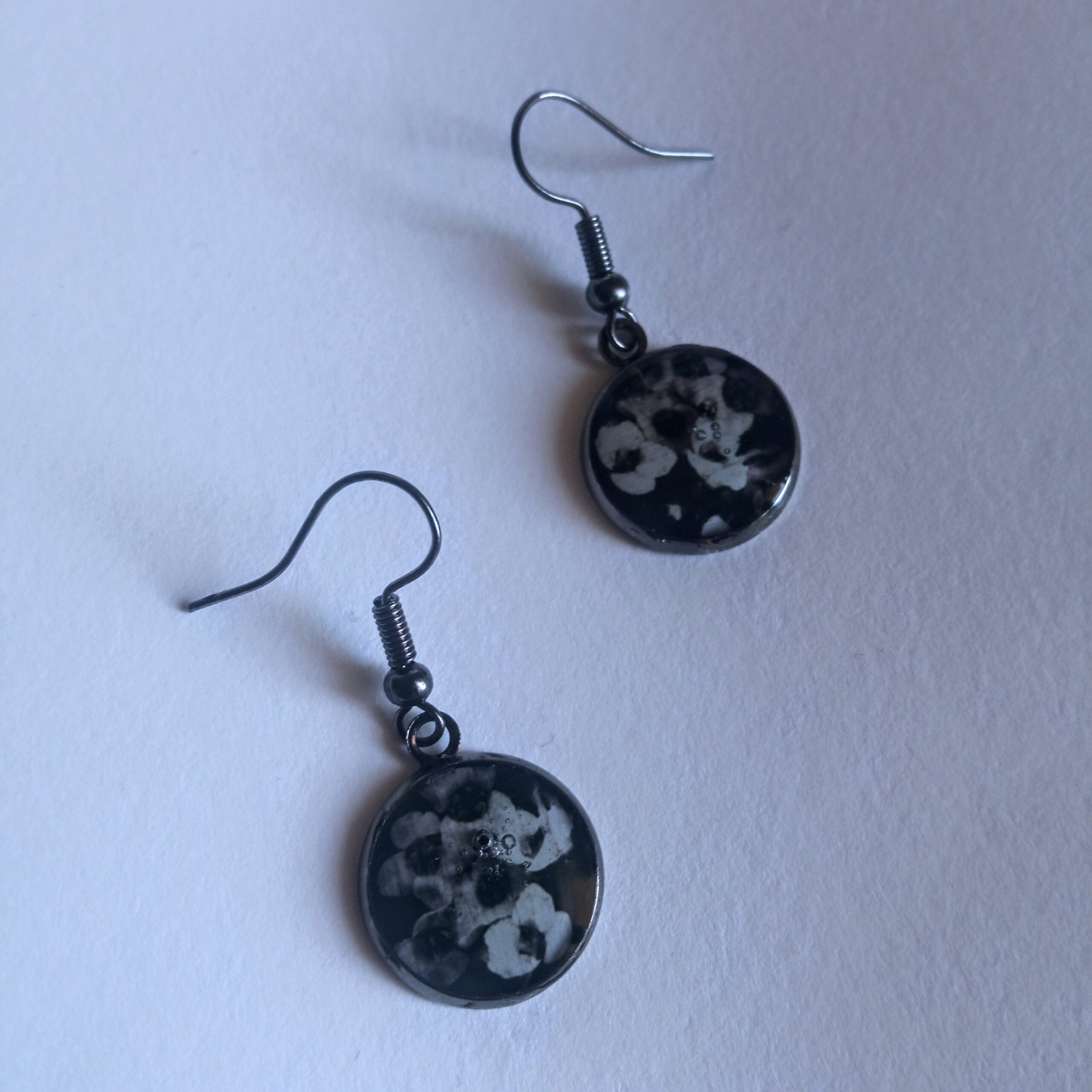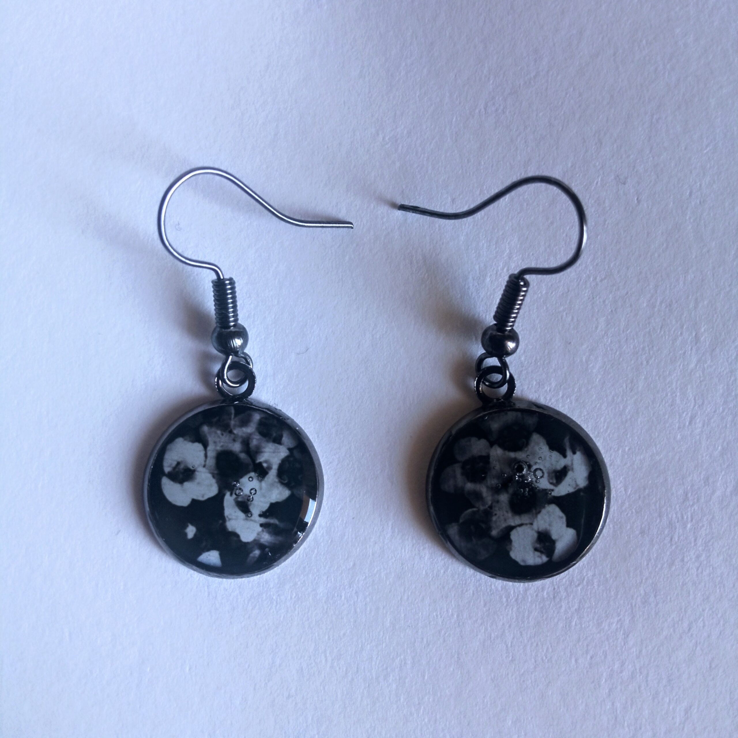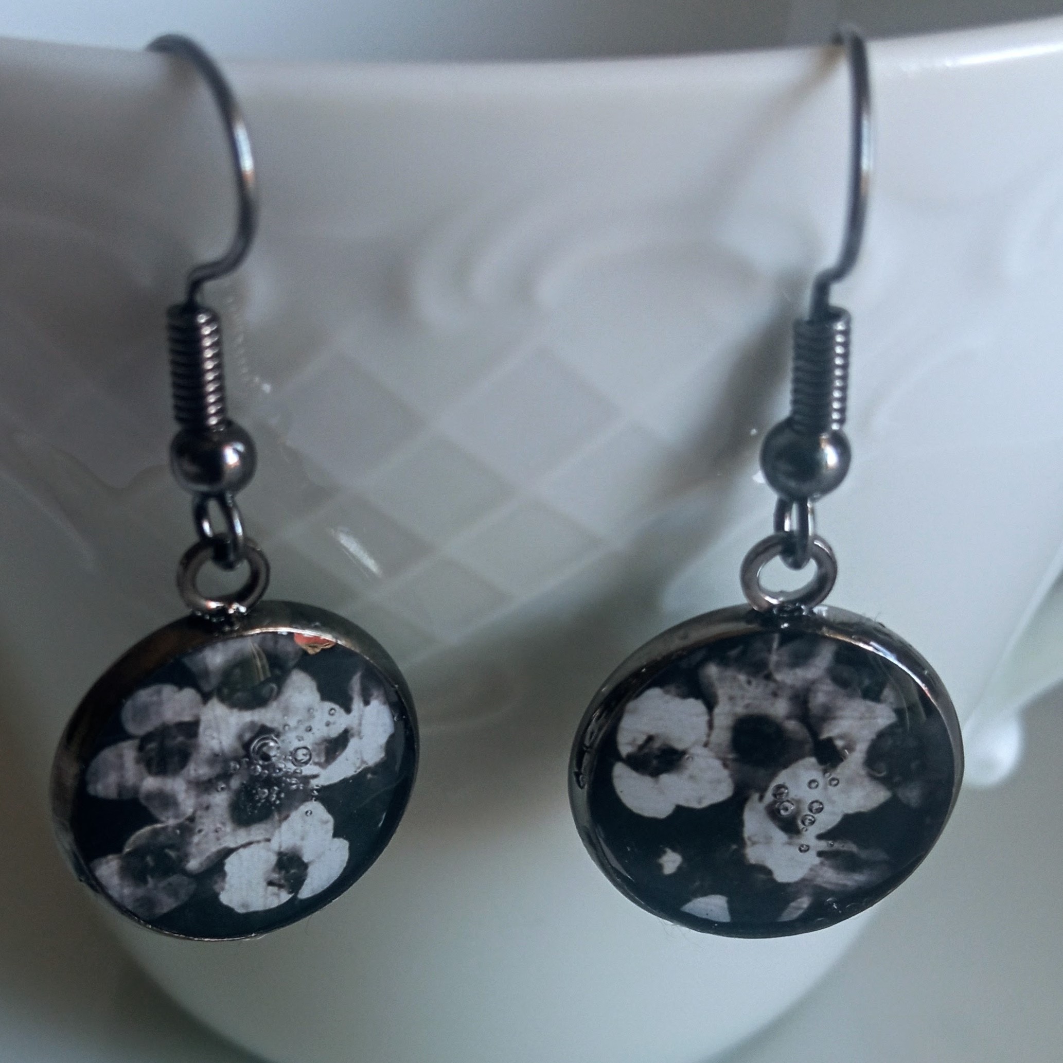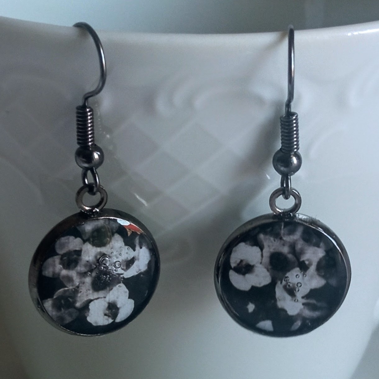 Σκουλαρίκια vintage ατσάλινα, σε μολυβί χρώμα, κρεμαστά με γαντζάκι. Απεικονίζουν λευκά λουλούδια σε μαύρο φόντο και είναι επικαλυμμένα με υγρό γυαλί.