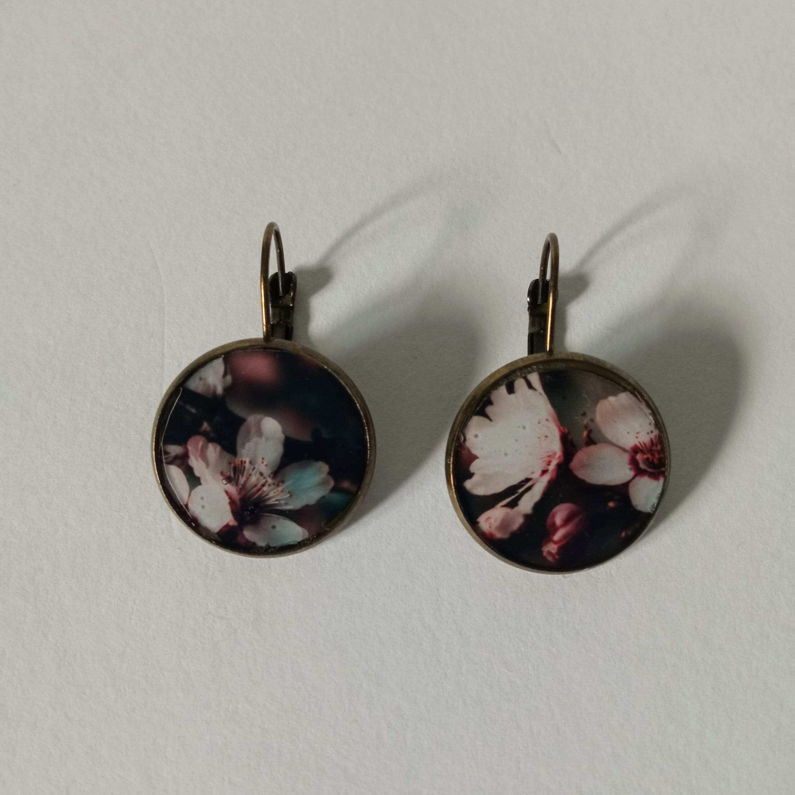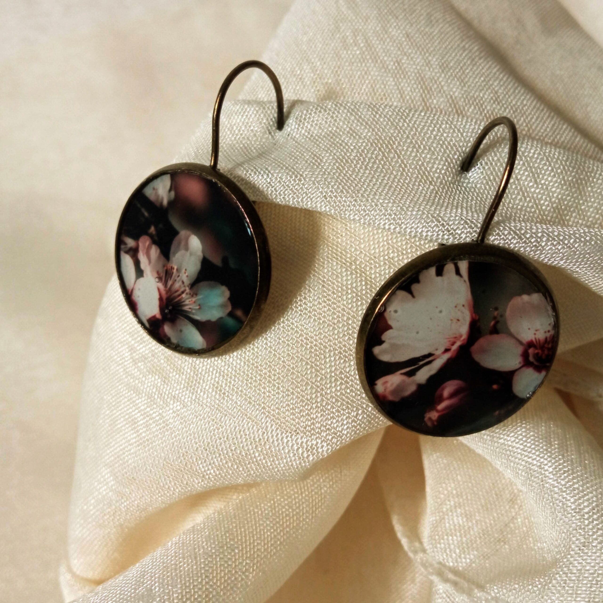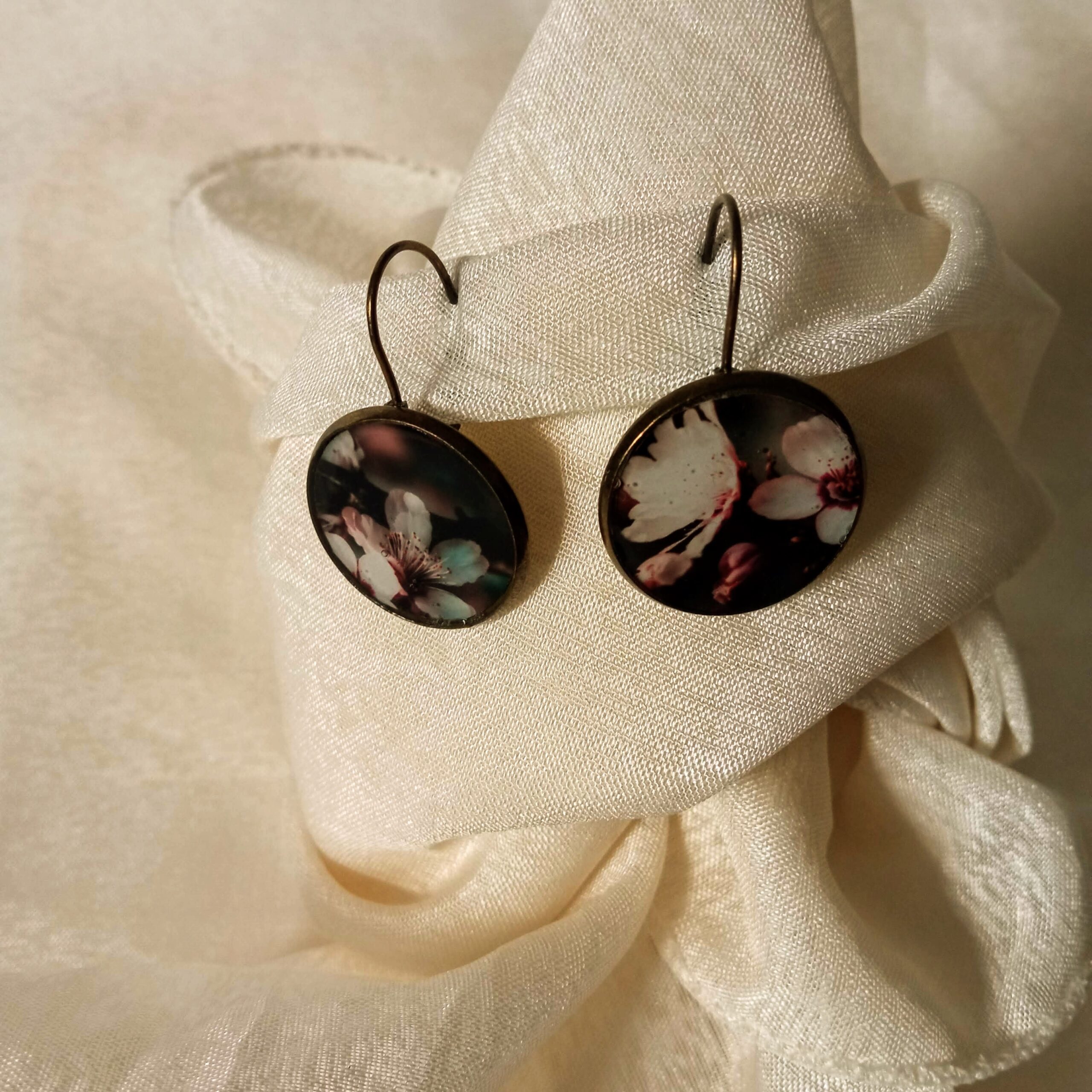 Σκουλαρίκια χειροποίητα, vintage, από ορείχαλκο μπρονζέ αντικέ, κρεμαστά με γαντζάκι. Απεικονίζουν άνθη αμυγδαλιάς και είναι επικαλυμμένα με υγρό γυαλί.