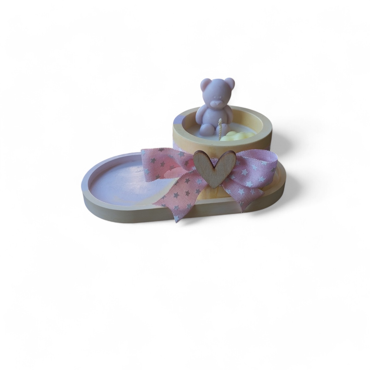 Αρωματικό κερί σόγιας με ένα γλυκό αρκουδάκι μαζί με ένα συννεφάκι που συνοδεύεται από αντίστοιχο δίσκο -βάση σε χρώματα κίτρινο-λιλά.