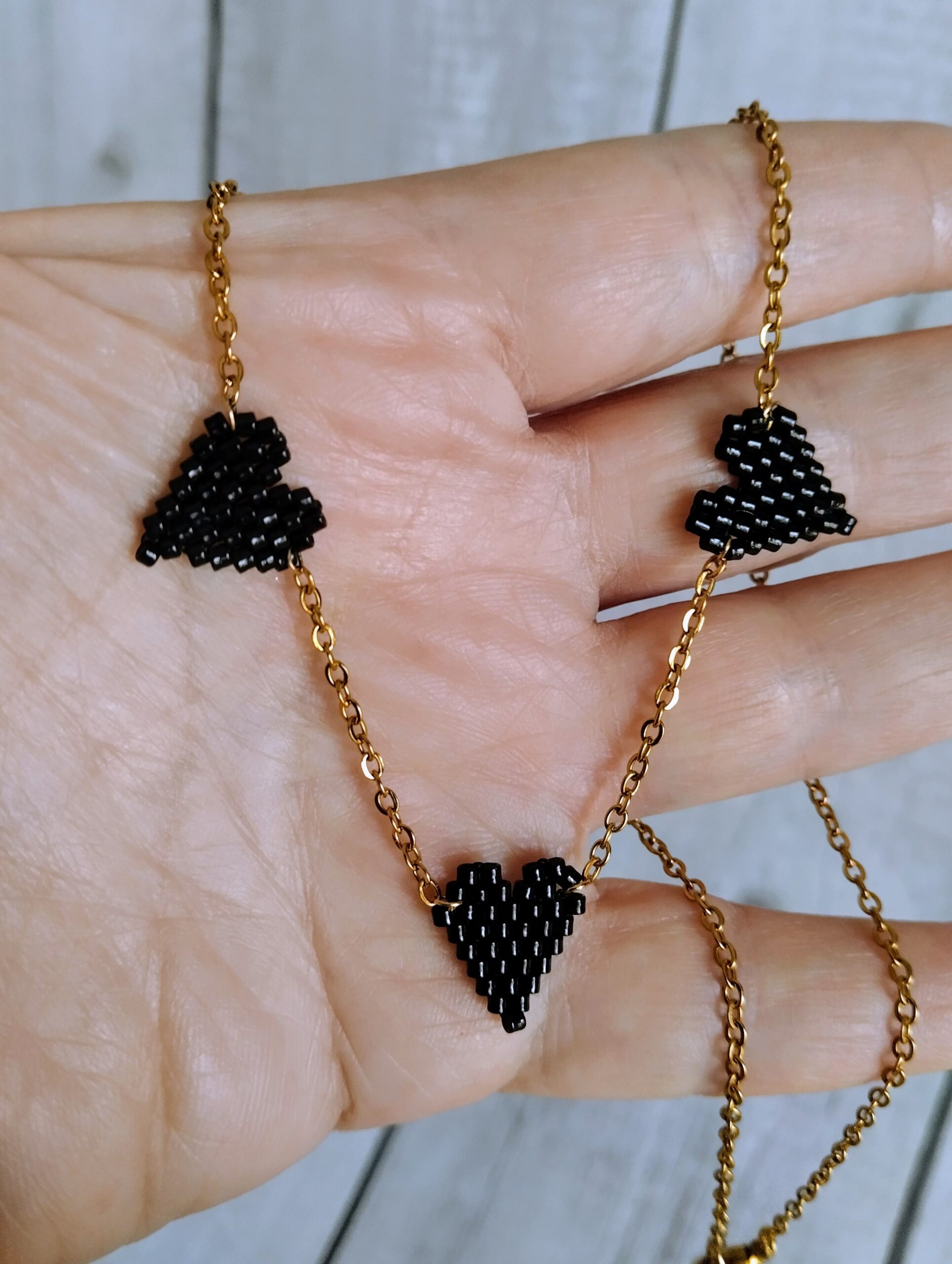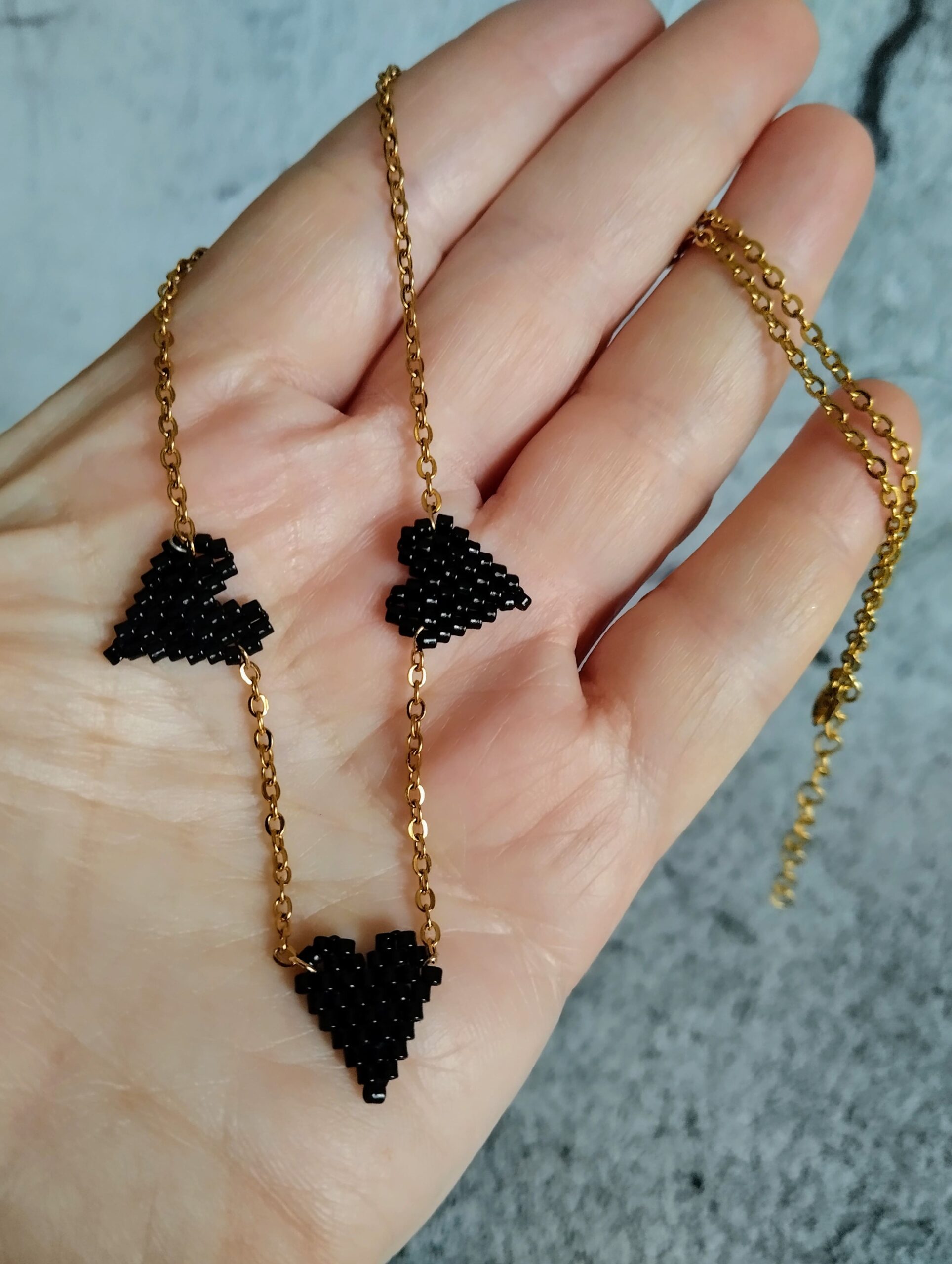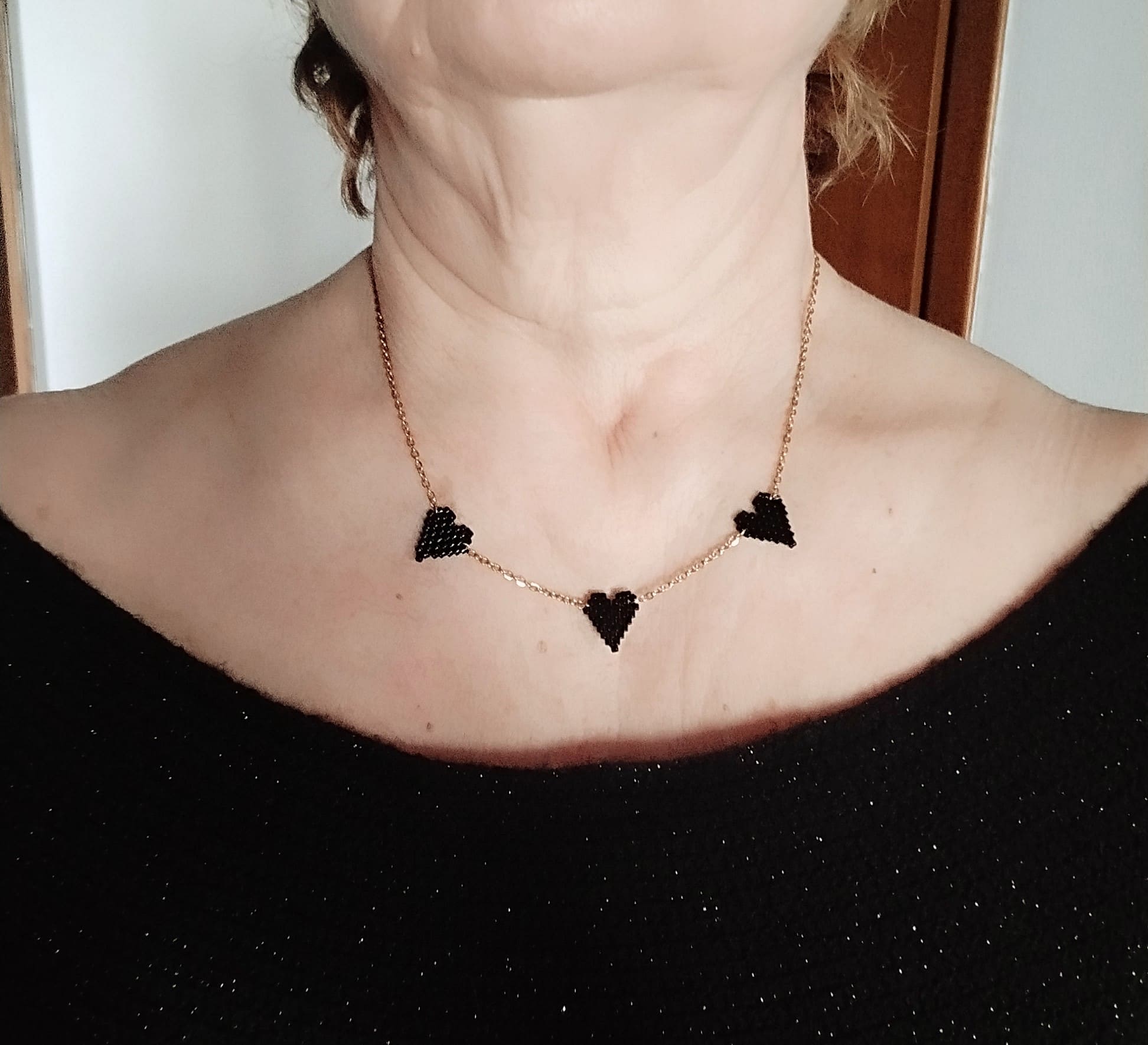 Αναδείξτε τη θυληκότητα σας με ένα κολιέ που μαγνητίζει τα βλέμματα!! Ελαφρύ, κομψό και απόλυτα εντυπωσιακό αυτό το υπέροχο χειροποίητο κόσμημα!! Είναι με χάντρες miyuki που σχηματίζουν τρεις υπέροχες μαύρες καρδούλες!!