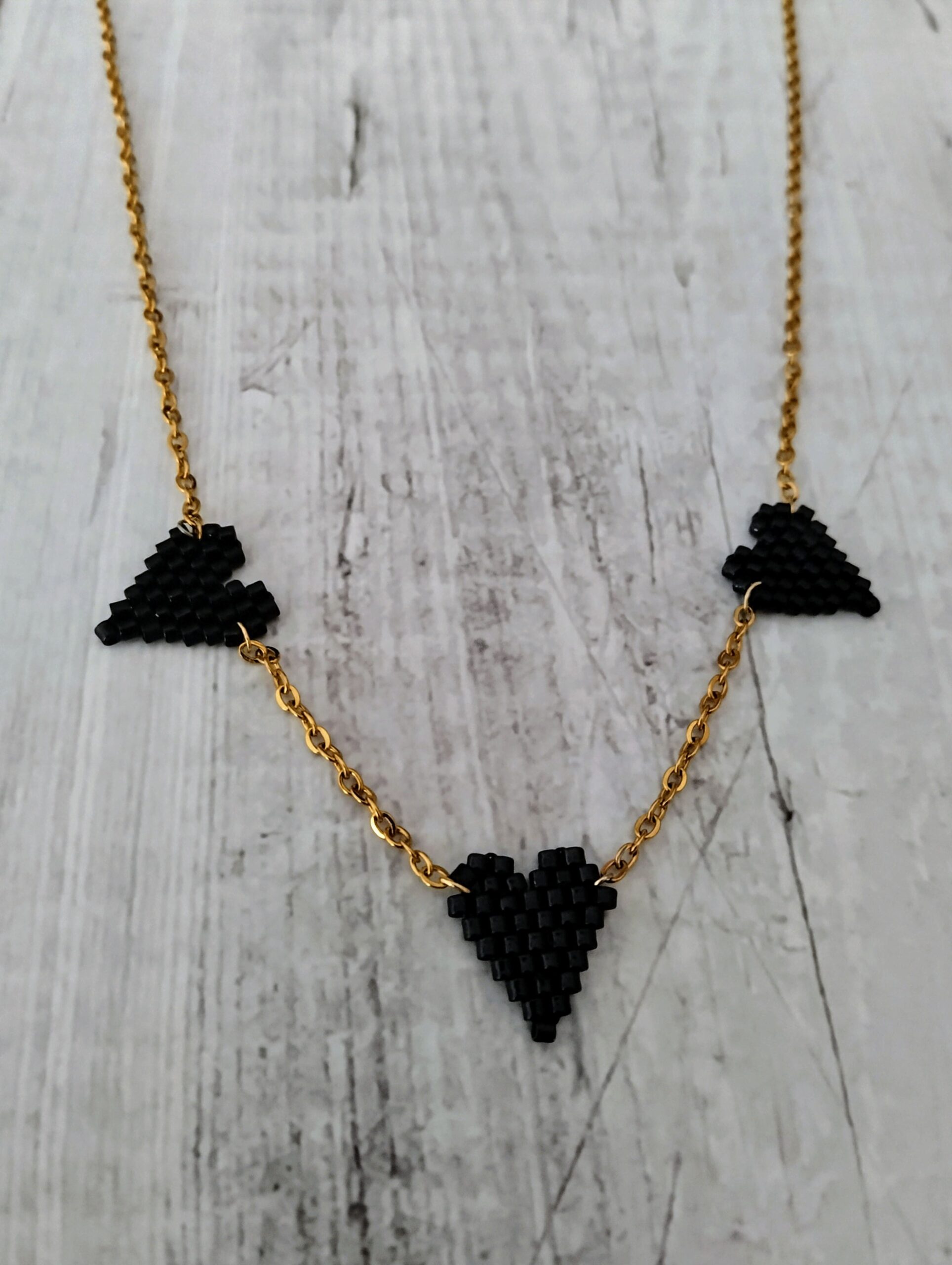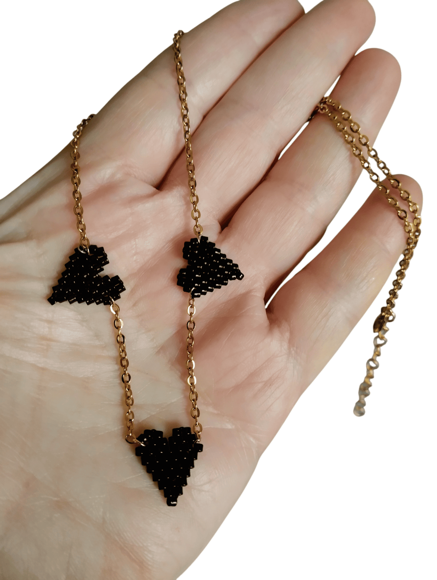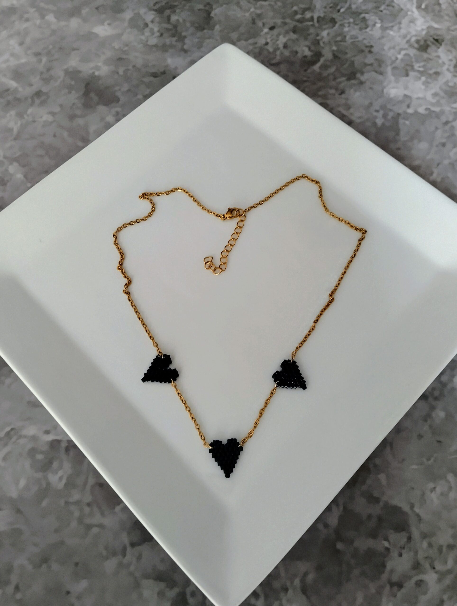 Αναδείξτε τη θυληκότητα σας με ένα κολιέ που μαγνητίζει τα βλέμματα!! Ελαφρύ, κομψό και απόλυτα εντυπωσιακό αυτό το υπέροχο χειροποίητο κόσμημα!! Είναι με χάντρες miyuki που σχηματίζουν τρεις υπέροχες μαύρες καρδούλες!!
