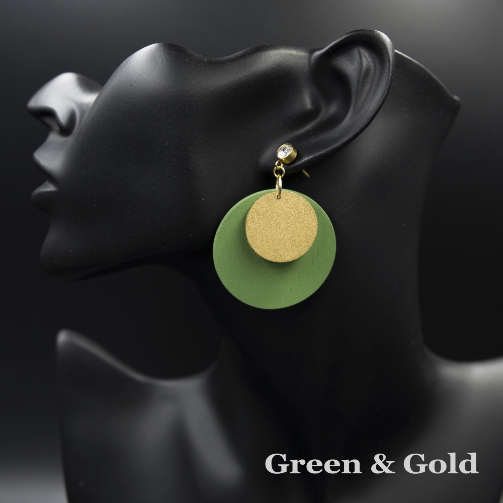 Ξύλινα, γεωμετρικά σκουλαρίκια σε σχήμα κύκλο. Τα σκουλαρίκια αποτελούνται από δύο μέρη: δύο κύκλοι πού κινούνται ελεύθερα. Ο μικρός κύκλος είναι βαμμένο με χρυσό χρώμα και έτσι έχεις την εντύπωση ότι είναι μεταλλικό αλλά είναι πολύ ελαφρύ λόγω ξύλου. Ο μεγαλύτερος είναι βαμμένο με Λαδί χρώμα. Αυτά τα σκουλαρίκια είναι πολύ εντυπωσιακά και ταυτόχρονα πολύ ελαφριά. τα χρώματα που έχω χρησιμοποιήσει είναι ακρυλικά υψηλής ποιότητας με μεγάλη διάρκεια έχουν ένα ματ φινίρισμα. Είναι πολύ ελαφριά και άνετα να φορεθούν.