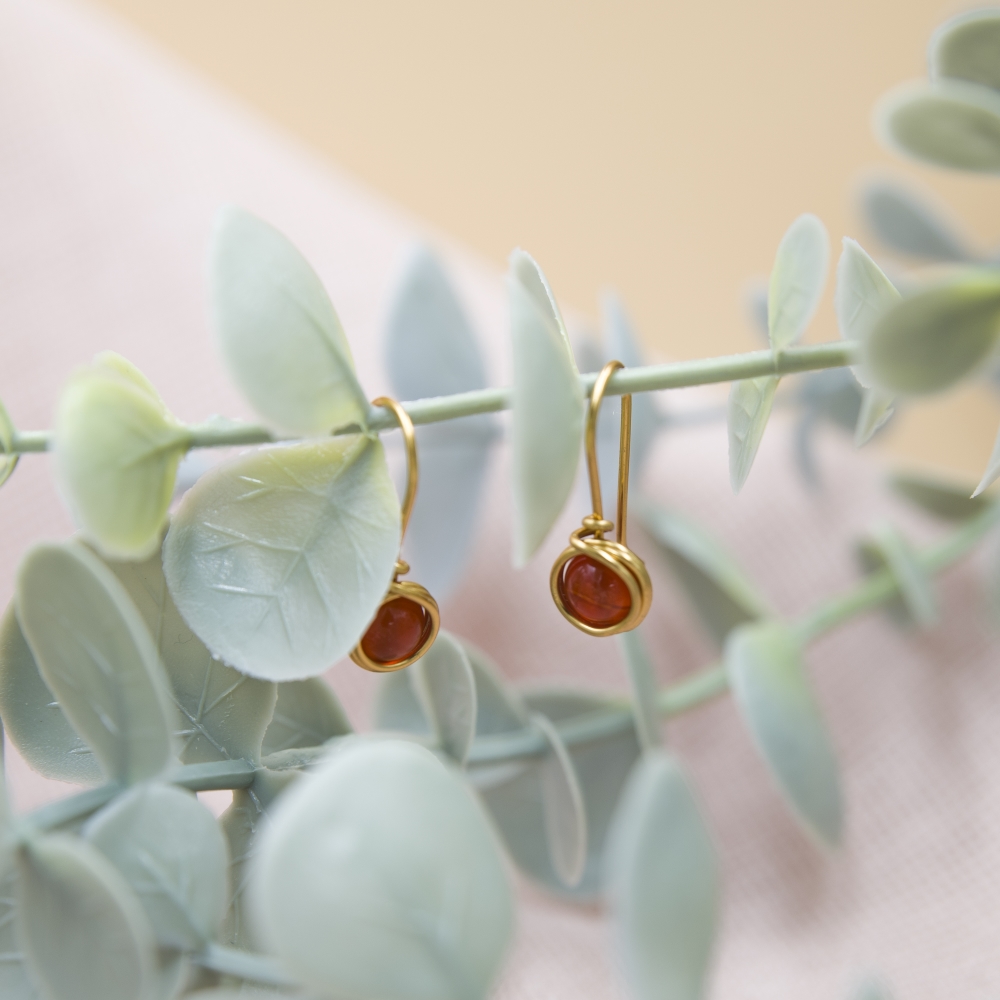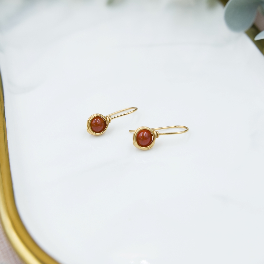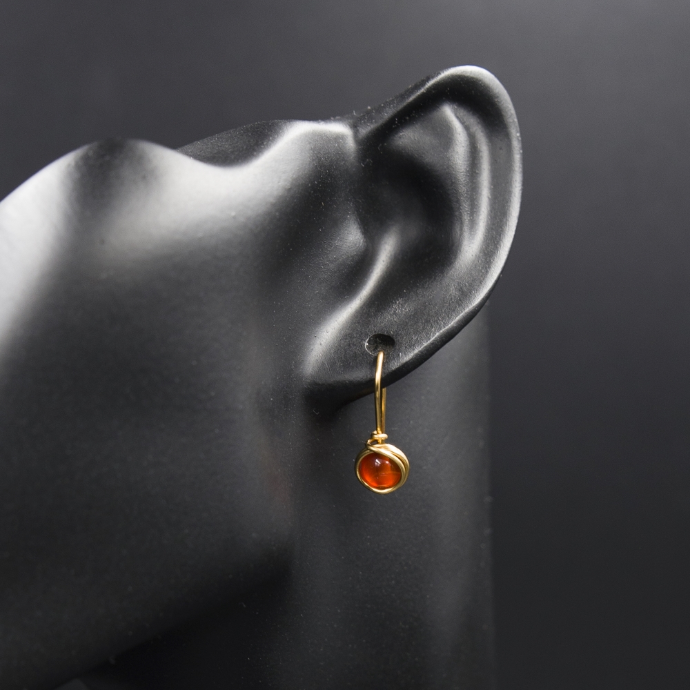 Χειροποίητα μικρά σκουλαρίκια από επίχρυσο ορείχαλκο και φυσική χάντρα από Καρνεόλη. Έρχονται με στοπάκια.