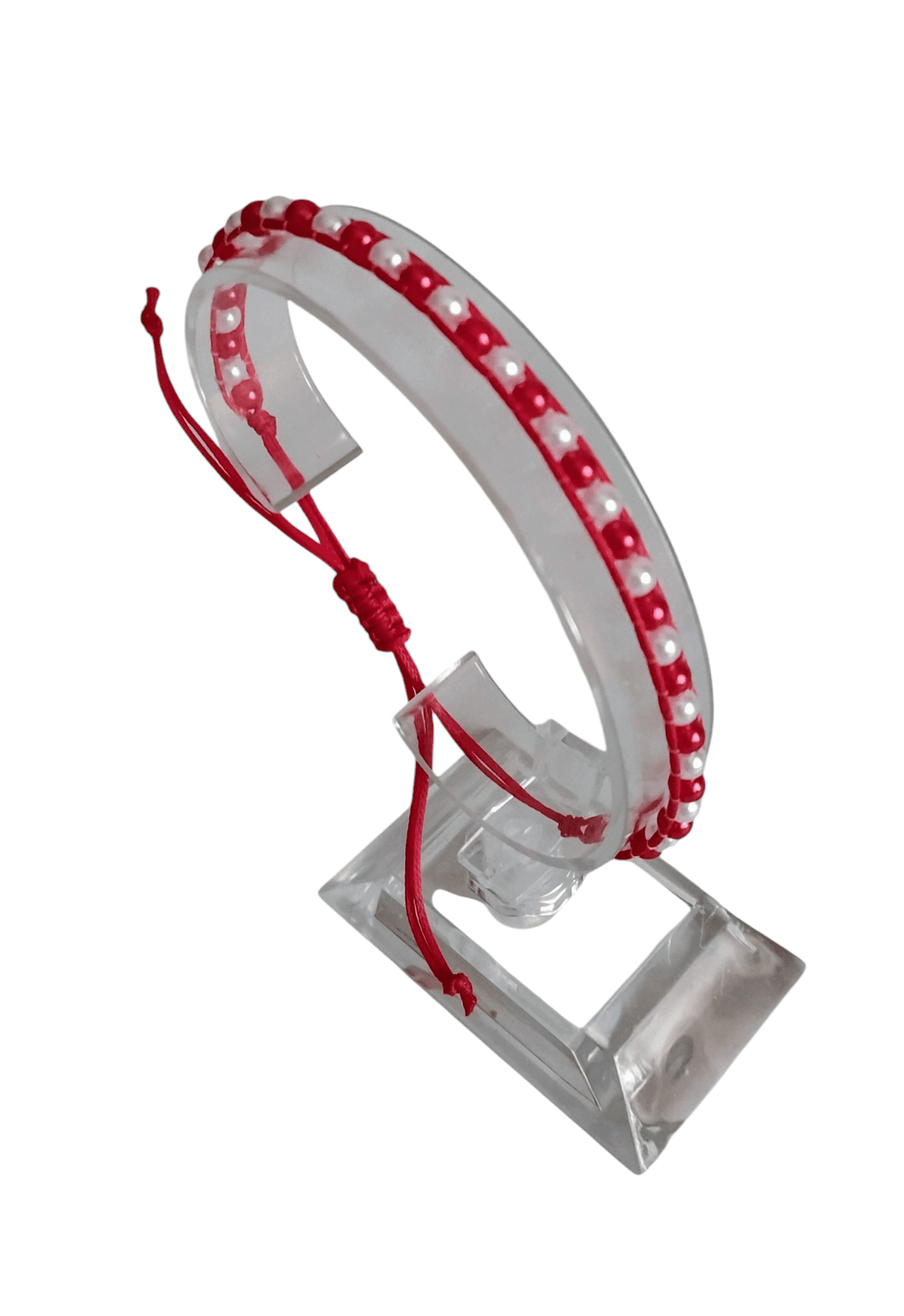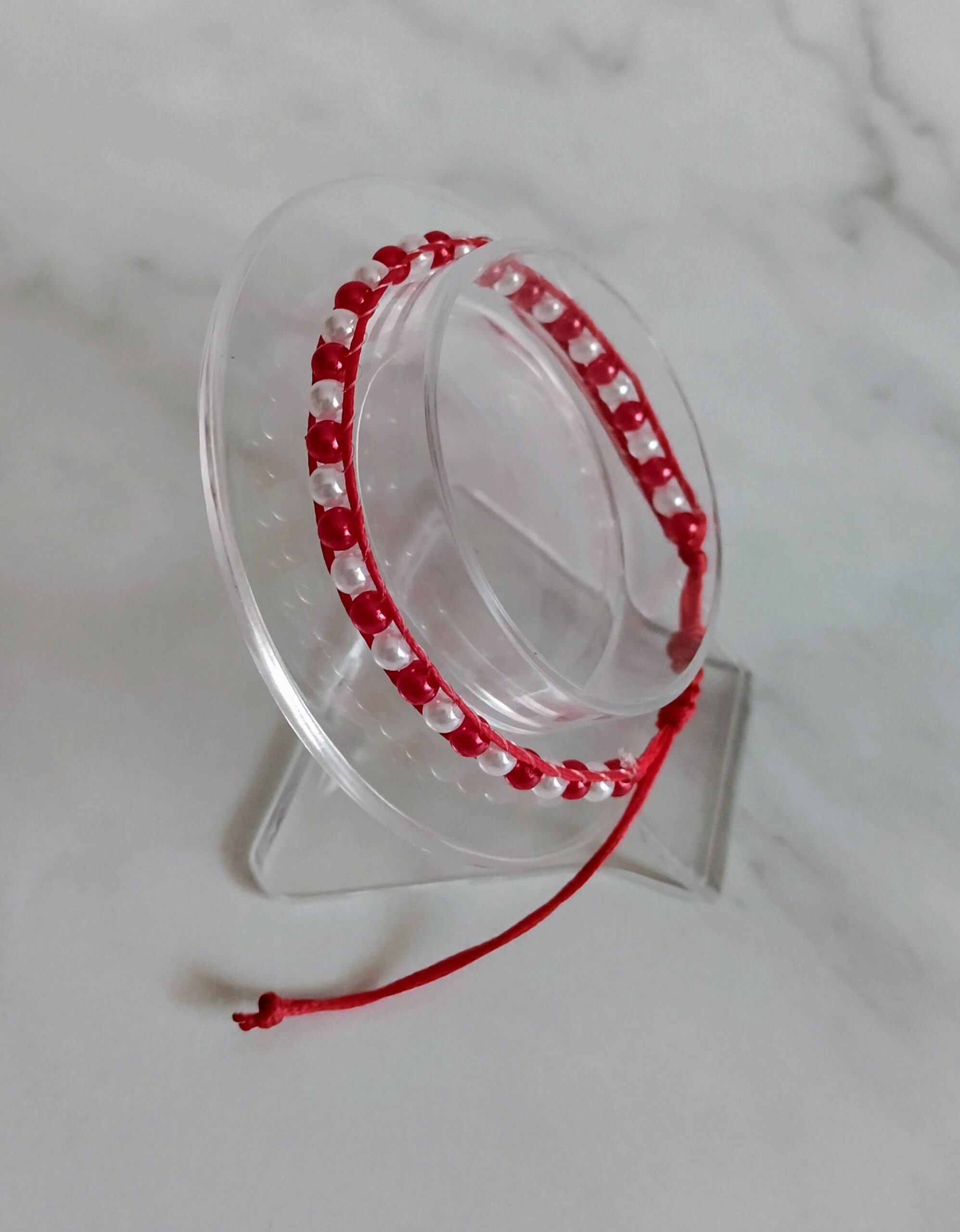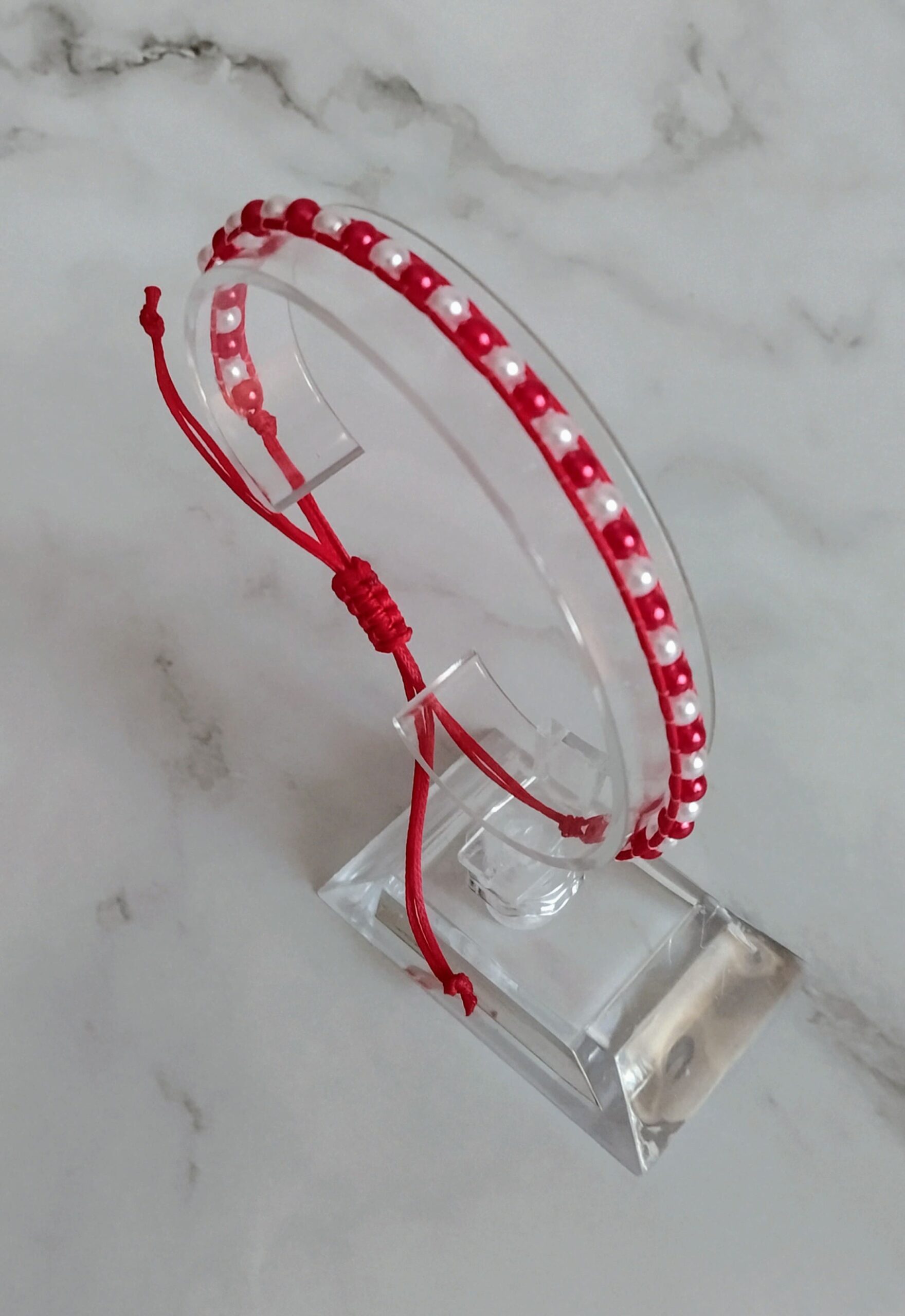 Είναι με πέρλες κόκκινες και άσπρες 4mm, το κορδόνι του είναι κηροκλωστή, ειδική για μακραμέ.
