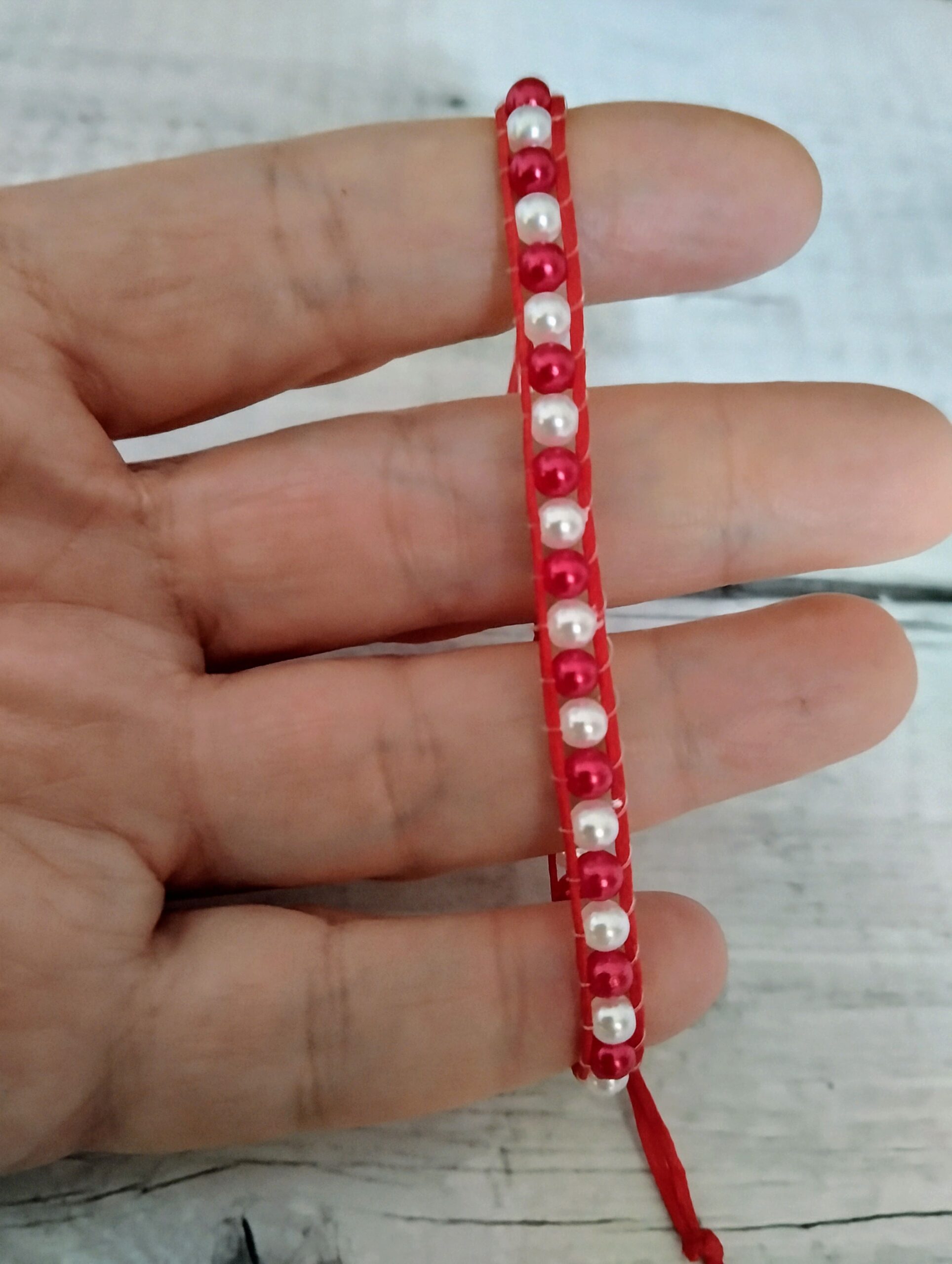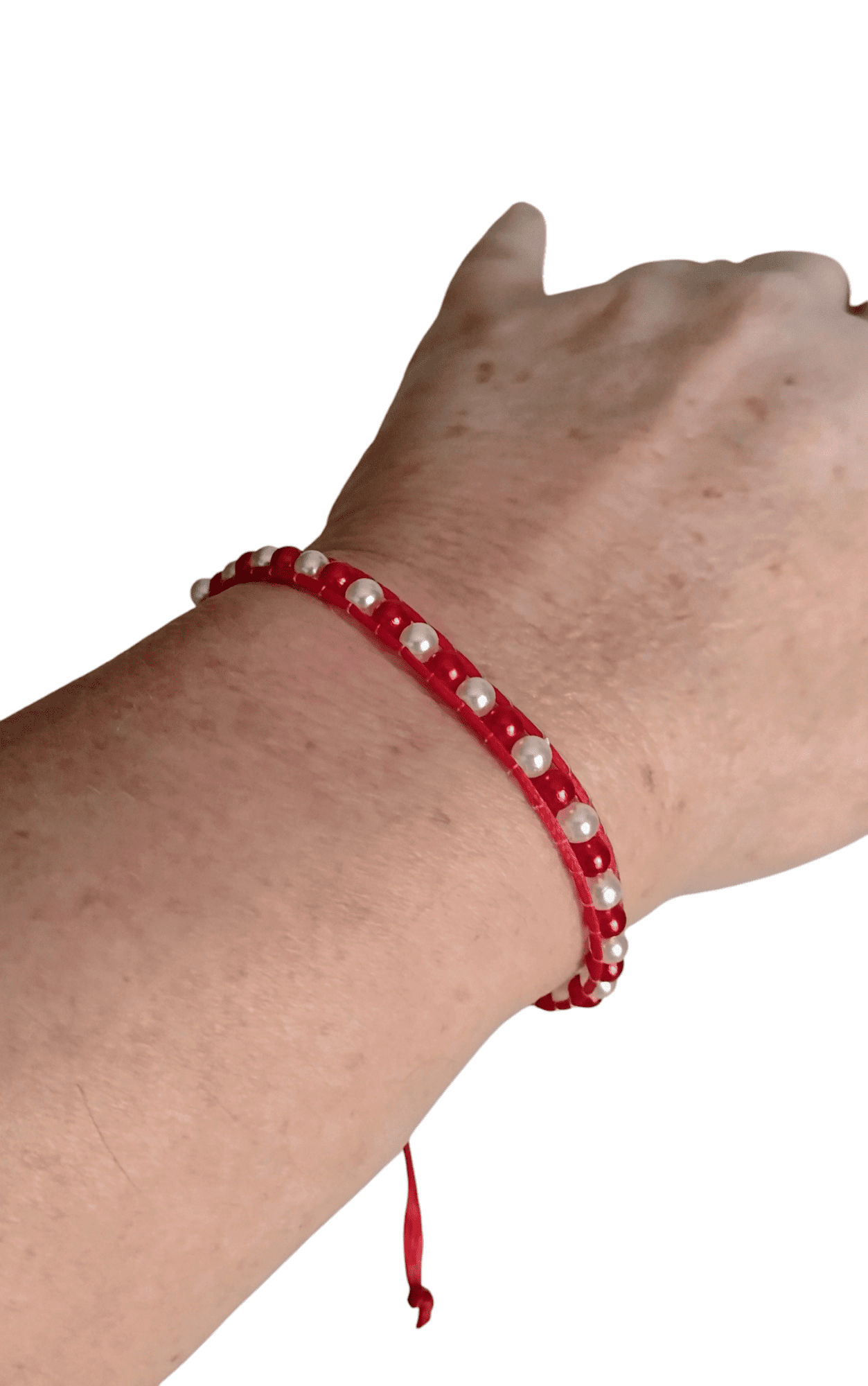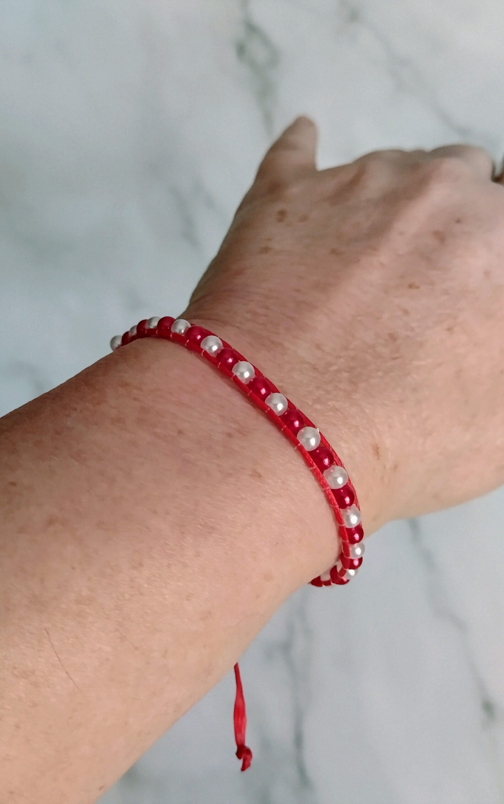 Είναι με πέρλες κόκκινες και άσπρες 4mm, το κορδόνι του είναι κηροκλωστή, ειδική για μακραμέ.