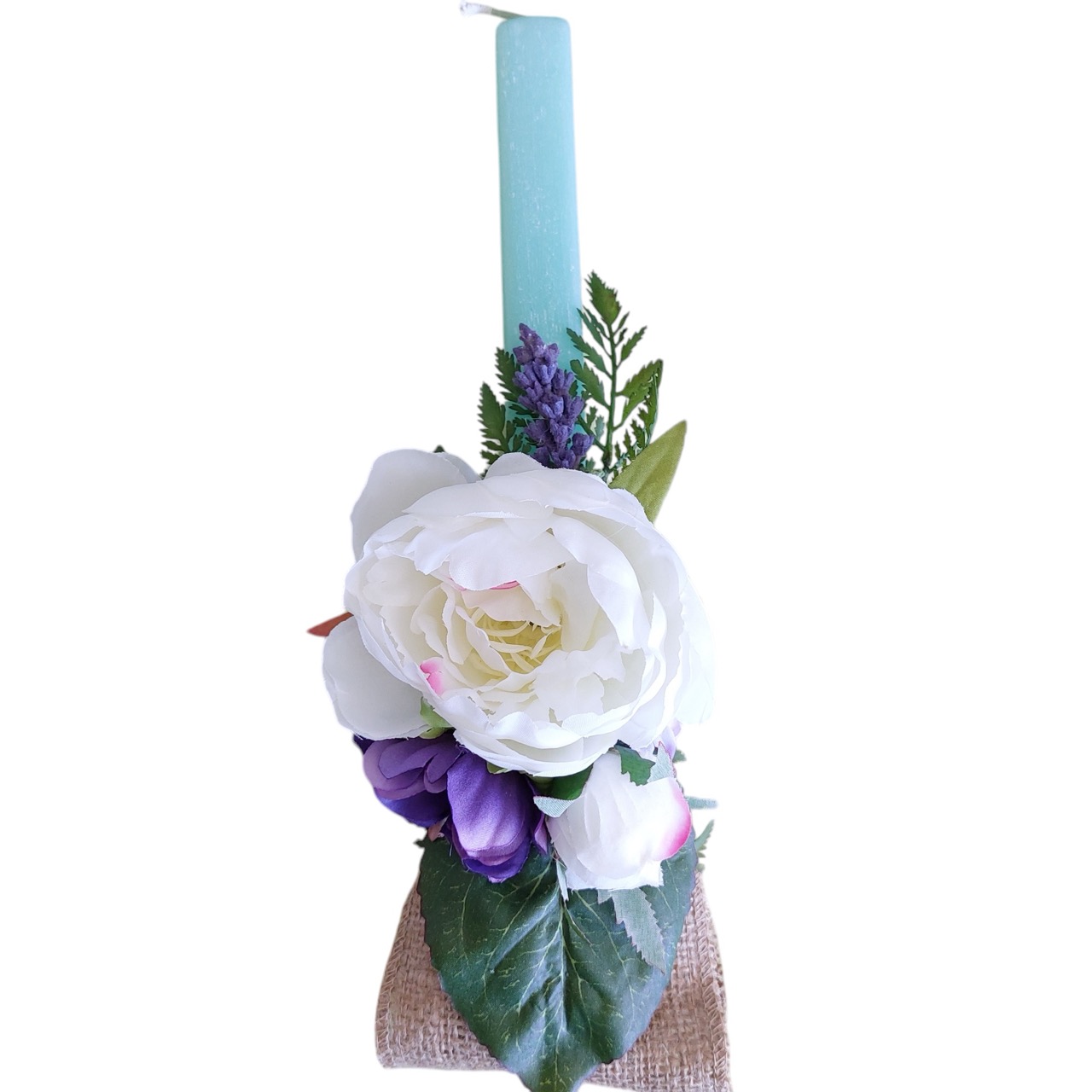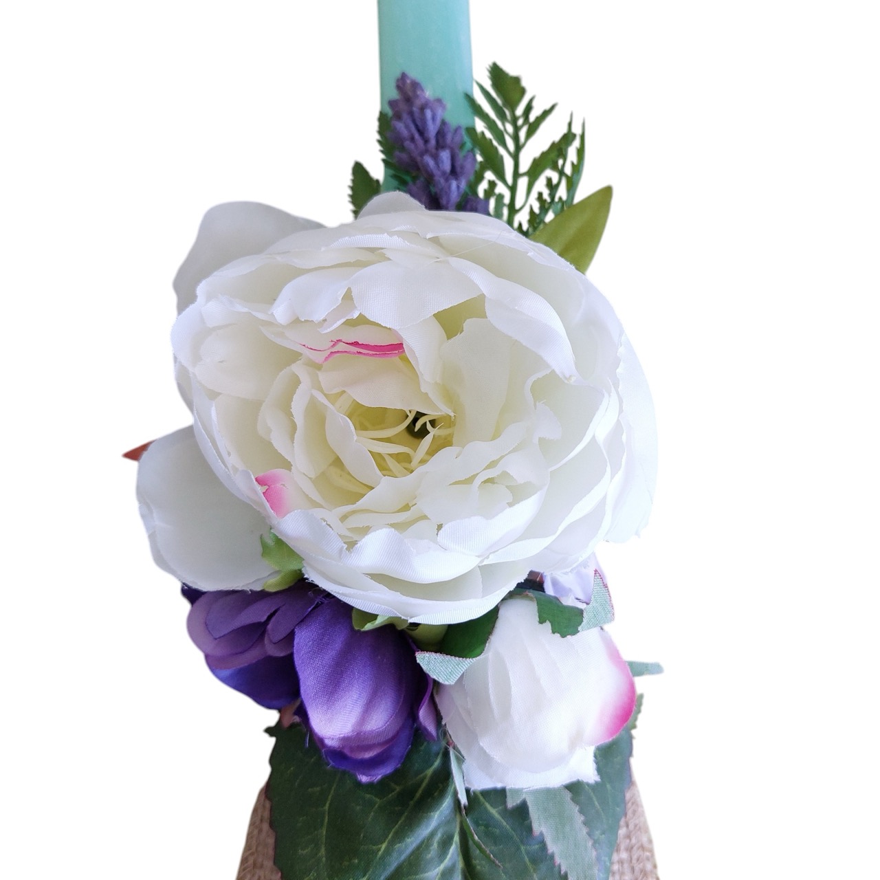 Βεραμάν ξυστή λαμπάδα 30εκ., στολισμένη με λουλούδια σε λευκούς μοβ και ροζ τόνους