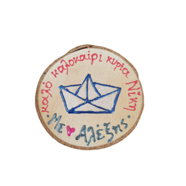 ξύλινο μαγνητάκι ζωγραφισμένο στο χέρι σε φυσική φέτα ξύλου 8 -12 cm.