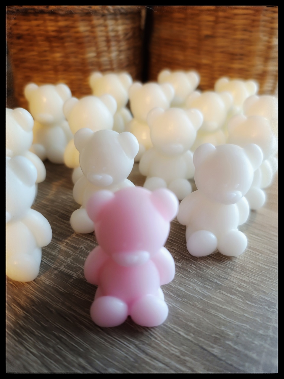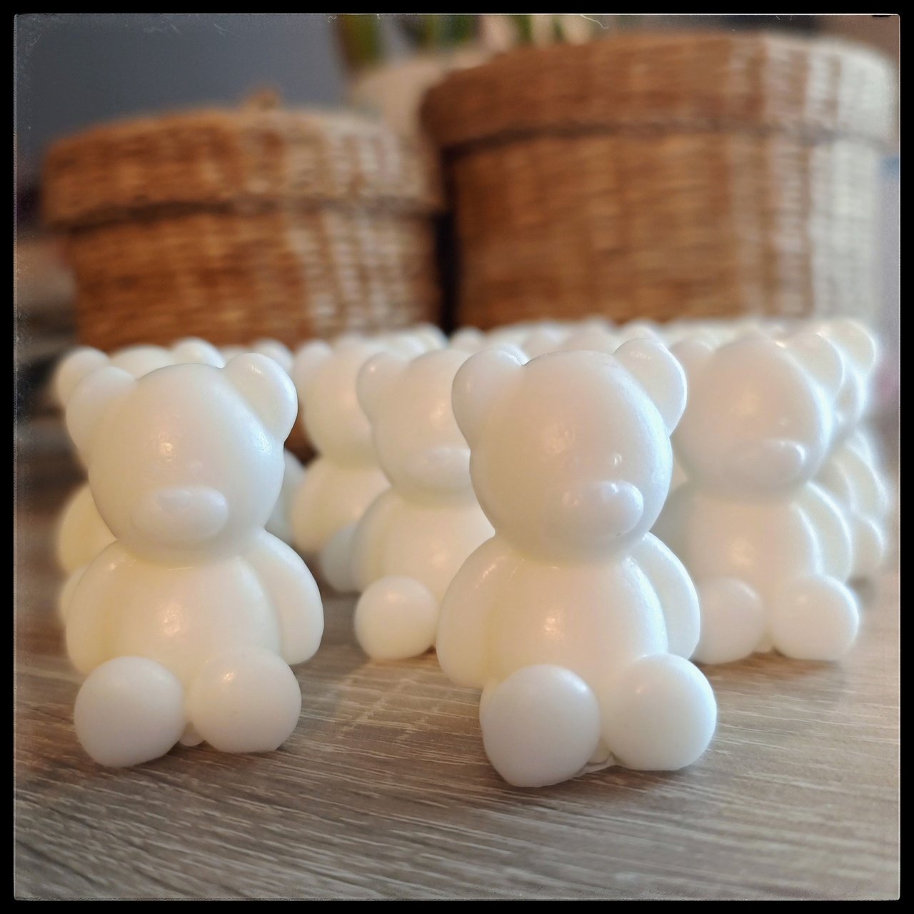 Όμορφα, μικρά σαπουνάκια σε σχήμα αρκουδάκι (Teddy Bear) με βάση γλυκερίνης, ιδανικά για δωράκια γενεθλίων ή μπομπονιέρα βάπτισης. Με ύψος 4 εκ. και βάρος περίπου 35 γρ., αυτά τα σαπουνάκια είναι διαθέσιμα σε ποικιλία χρωμάτων και αρωμάτων, προσαρμοσμένα στις επιθυμίες σας.